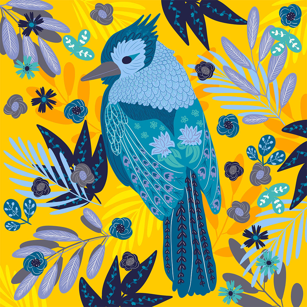 Plongez dans les détails de l’illustration Blue Jay avec son ambiance colorée.