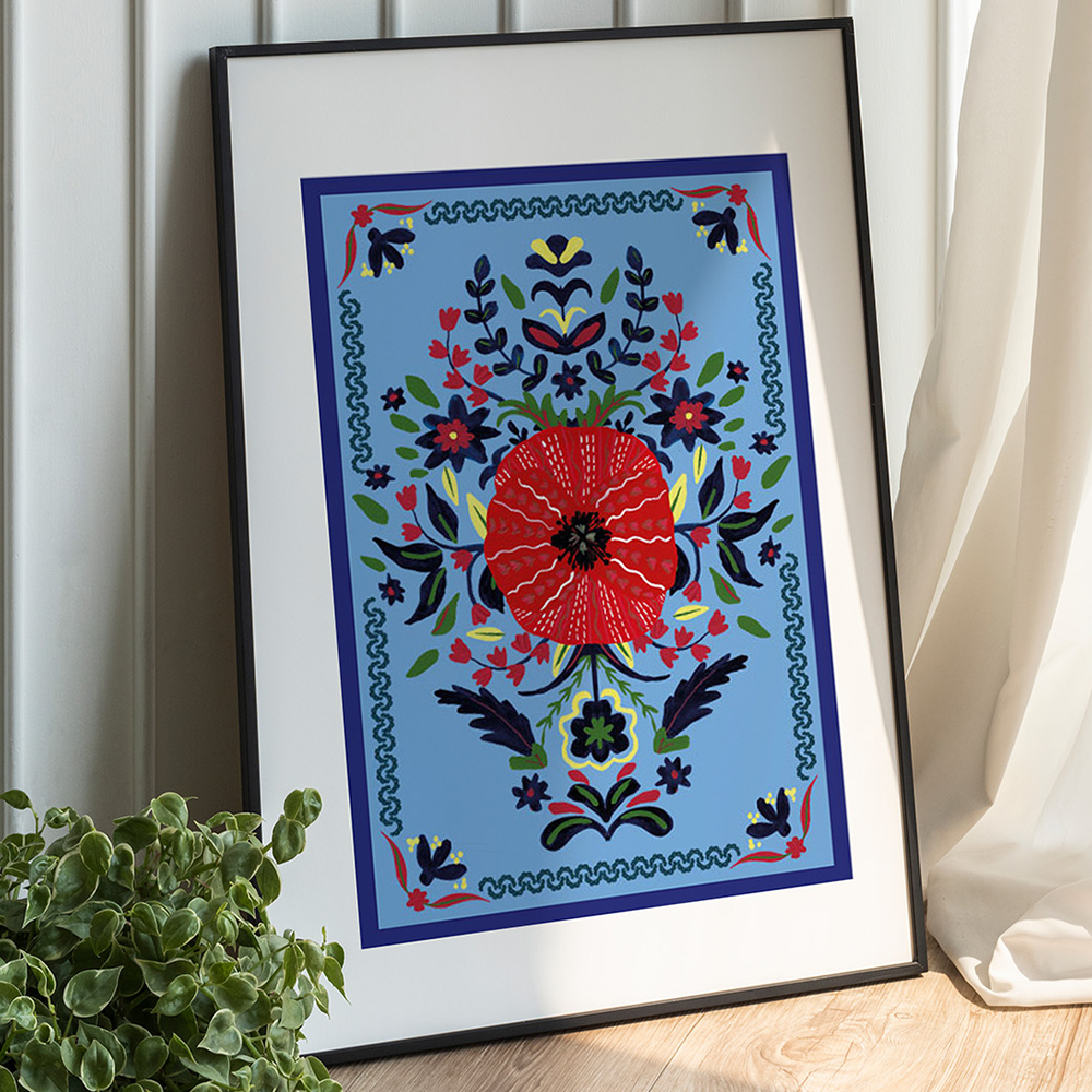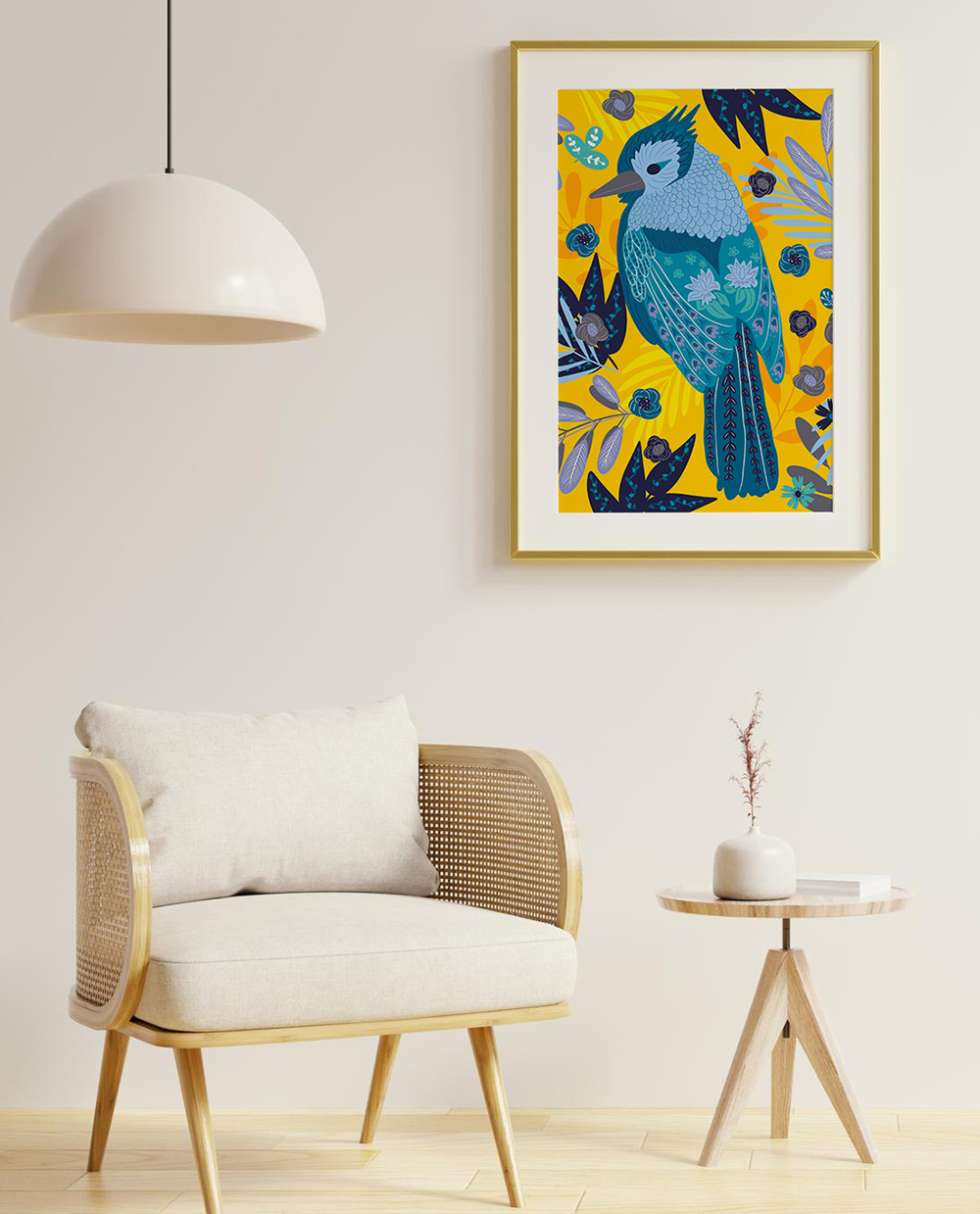 Illustration digitale représentant un blue jay aux détails décoratifs et ornementaux qui rendent ce dessin poétique, un peu comme un hommage à la nature. L’affiche Blue Jay est disponible en format digitale sur ma boutique. C’est une illustration qui peut également se qualifier de motif placé et que l’on peut appliquer, par exemples, sur un coussin, un mug, un foulard, une coque de téléphone ou encore un tote-bag.