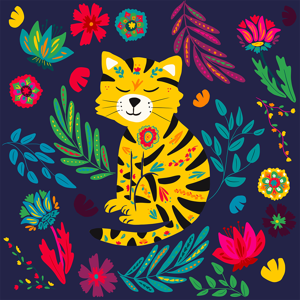 Découvrez en détail l’illustration Tigre et son atmosphère florale.